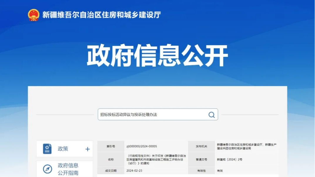 近日,新疆維吾爾自治區(qū)住房和城鄉(xiāng)建設廳、新疆生產(chǎn)建設兵團住房和城鄉(xiāng)建設局印發(fā)《新疆維吾爾自治區(qū)房屋建筑和市政基礎設施工程施工評標辦法(試行)》(以下簡稱《施工評...