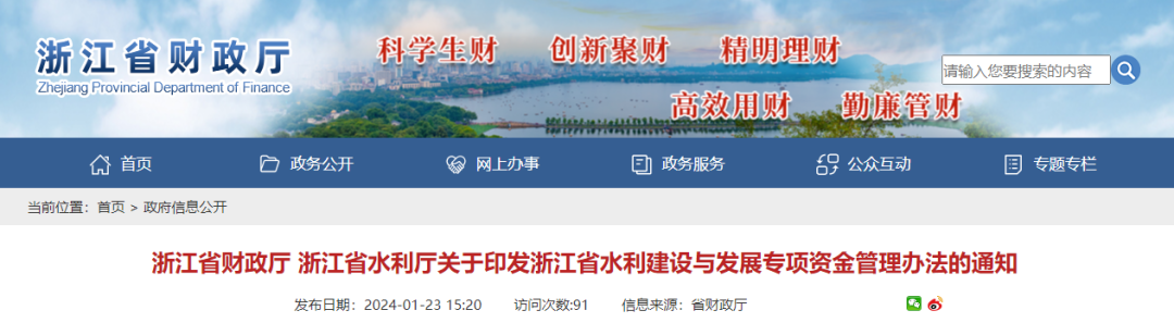 近日,浙江省財(cái)政廳發(fā)布《關(guān)于印發(fā)浙江省水利建設(shè)與發(fā)展專項(xiàng)資金管理辦法的通知》。本辦法自2024年3月1日起施行。
