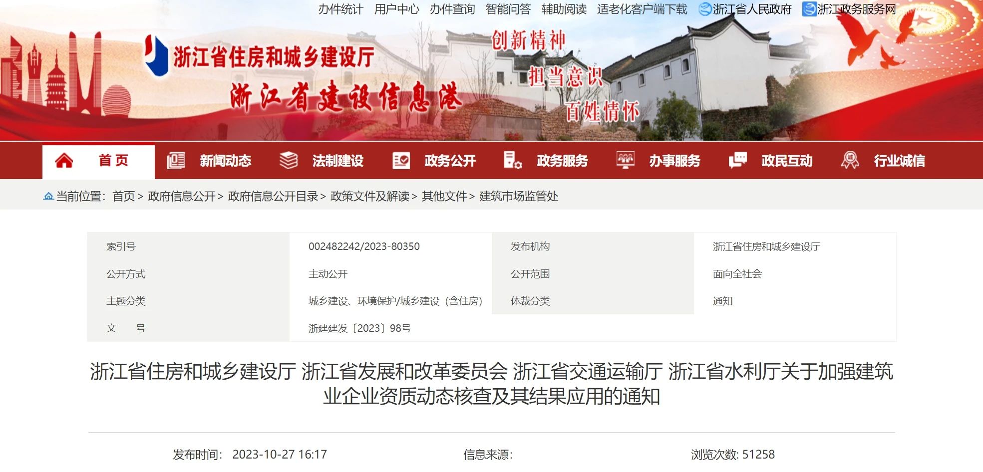 近日,浙江省住建廳聯(lián)合省發(fā)改委、浙江省交通運(yùn)輸廳、浙江省水利廳等發(fā)布《關(guān)于加強(qiáng)建筑業(yè)企業(yè)資質(zhì)動(dòng)態(tài)核查及其結(jié)果應(yīng)用的通知》(以下簡(jiǎn)稱《通知》)。決定自2023年11月15日起,在房屋建筑和市政工程、公路水運(yùn)工程、...