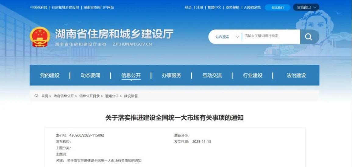 近日,湖南省住房和城鄉(xiāng)建設(shè)廳發(fā)布《湖南省住房和城鄉(xiāng)建設(shè)廳關(guān)于落實(shí)推進(jìn)建設(shè)全國統(tǒng)一大市場(chǎng)有關(guān)事項(xiàng)的通知》。