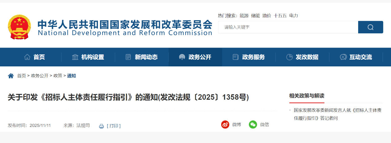 國家發(fā)展改革委等部門關(guān)于印發(fā)《招標人主體責任履行指引》的通知發(fā)改法規(guī)〔2025〕1358號 各省、自治區(qū)、直轄市、新疆生產(chǎn)建設(shè)兵團發(fā)展改革委、工業(yè)和信息化主管部門、住房...