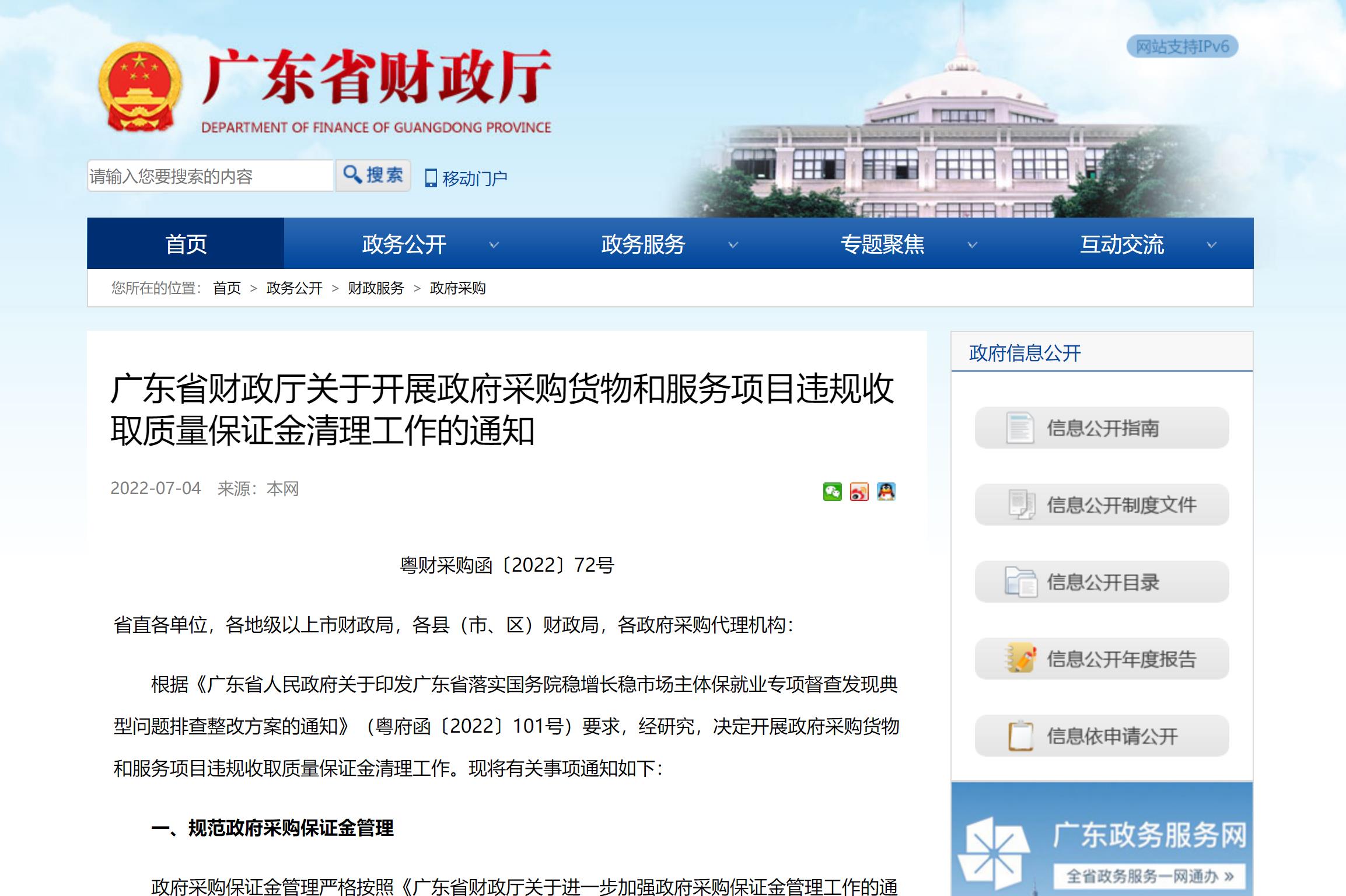 日前,珠海市財(cái)政局發(fā)布《關(guān)于開展政府采購(gòu)貨物和服務(wù)項(xiàng)目違規(guī)收取質(zhì)量保證金清理工作的通知》(以下簡(jiǎn)稱《通知》),其中明確,對(duì)2021年以來(lái)政府采購(gòu)貨物和服務(wù)項(xiàng)目違規(guī)收取質(zhì)量保證金問(wèn)題開展自查清理。...