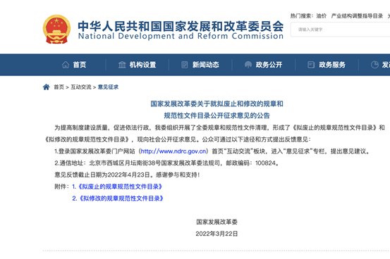 為提高制度建設(shè)質(zhì)量,促進(jìn)依法行政,近日,國(guó)家發(fā)展改革委發(fā)布《關(guān)于就擬廢止和修改的規(guī)章和規(guī)范性文件目錄公開征求意見的公告》(以下簡(jiǎn)稱《征求意見》)。
