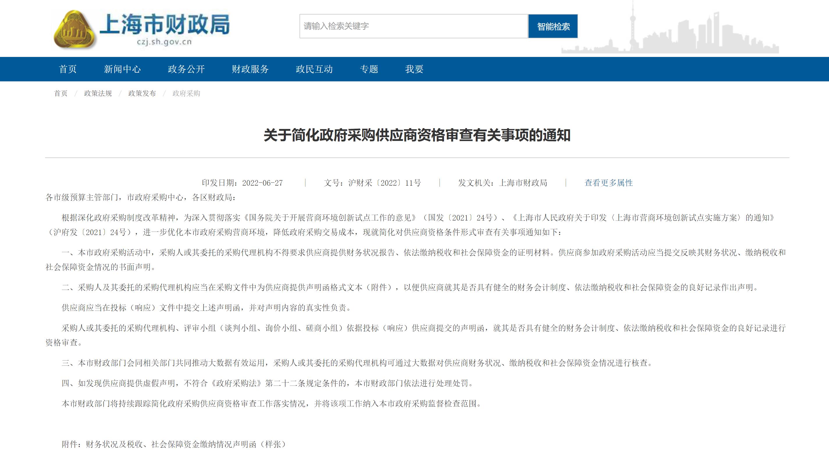 日前,上海市印發(fā)《關(guān)于簡(jiǎn)化政府采購(gòu)供應(yīng)商資格審查有關(guān)事項(xiàng)的通知》(以下簡(jiǎn)稱《通知》),以進(jìn)一步優(yōu)化本市政府采購(gòu)營(yíng)商環(huán)境,降低政府采購(gòu)交易成本。...