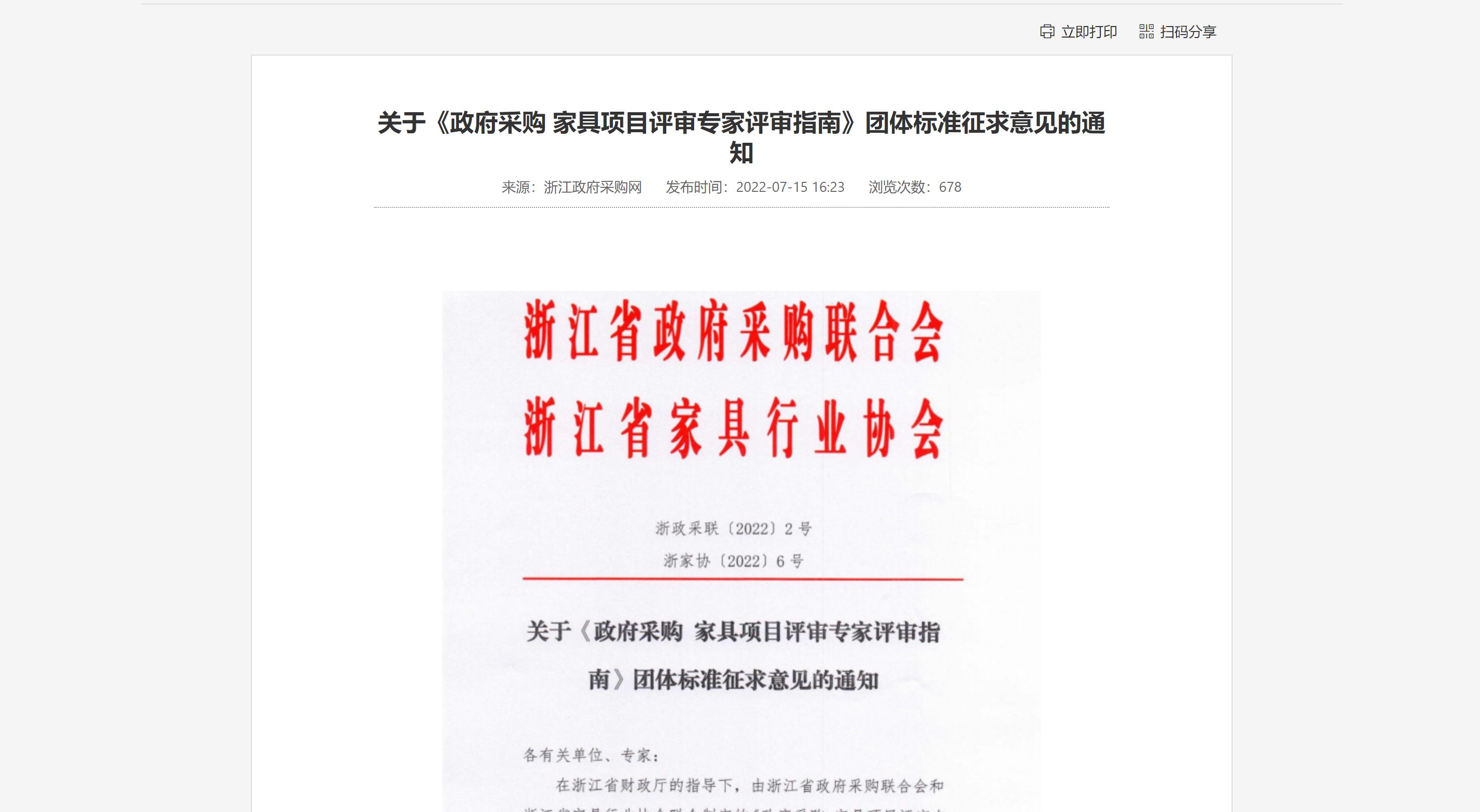 日前,浙江省政府采購聯(lián)合會和浙江省家具行業(yè)協(xié)會聯(lián)合制定《政府采購 家具項目評審專家評審指南》(以下簡稱《指南》)并公開征求意見。