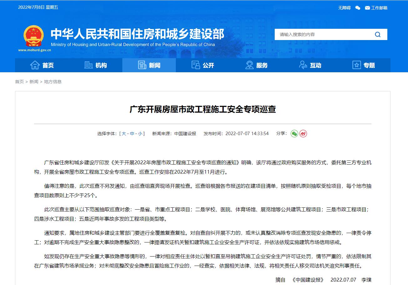 廣東省住房和城鄉(xiāng)建設廳印發(fā)《關于開展2022年房屋市政工程施工安全專項巡查的通知》明確,該廳將通過政府購買服務的方式,委托第三方專業(yè)機構(gòu),開展全省房屋市政工程施工安全專項巡查。巡查工作安排在2022年7月至11月進行...