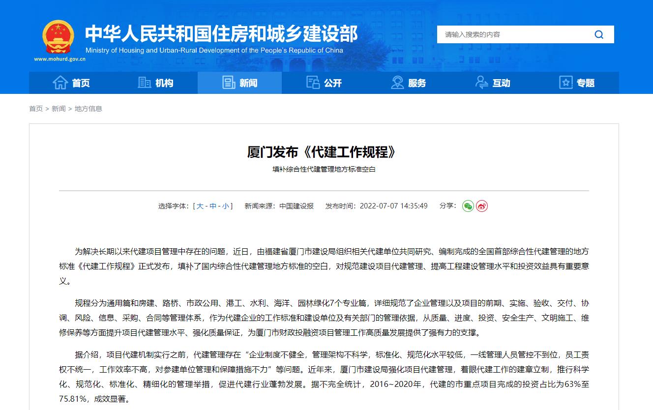 為解決長期以來代建項目管理中存在的問題,近日,由福建省廈門市建設局組織相關代建單位共同研究、編制完成的全國首部綜合性代建管理的地方標準《代建工作規(guī)程》正式發(fā)布,填補了國內(nèi)綜合性代建管理地方標準的空白,對規(guī)范建...