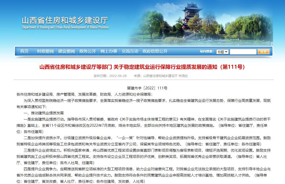 近日,山西省住建廳等4部門聯(lián)合發(fā)布《關(guān)于穩(wěn)定建筑業(yè)運(yùn)行保障行業(yè)提質(zhì)發(fā)展的通知》。