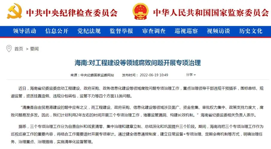 近日,海南省紀(jì)委監(jiān)委啟動工程建設(shè)、政府采購、政務(wù)信息化建設(shè)等領(lǐng)域腐敗問題專項治理工作,重點治理領(lǐng)導(dǎo)干部違規(guī)干預(yù)插手,圍標(biāo)串標(biāo)、規(guī)避監(jiān)管,資質(zhì)掛靠造假、違規(guī)分包轉(zhuǎn)包,監(jiān)管不...