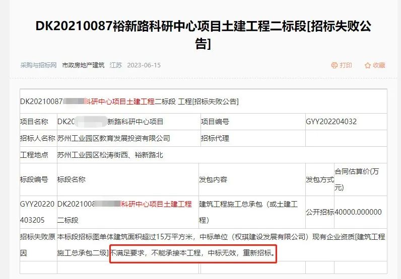 近日,中標(biāo)價(jià)超5.11億的某科研中心項(xiàng)目土建工程發(fā)布了招標(biāo)失敗的公告。 招標(biāo)失敗原因顯示“本標(biāo)段招標(biāo)圖單體建筑面積超過(guò)15萬(wàn)平方米,中標(biāo)單位現(xiàn)有企業(yè)資質(zhì)[建筑工程施工總承包二級(jí)]不滿(mǎn)足要求,不能承接本工程,中標(biāo)無(wú)效,重...